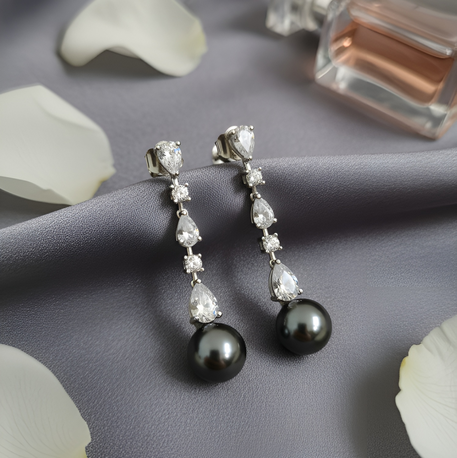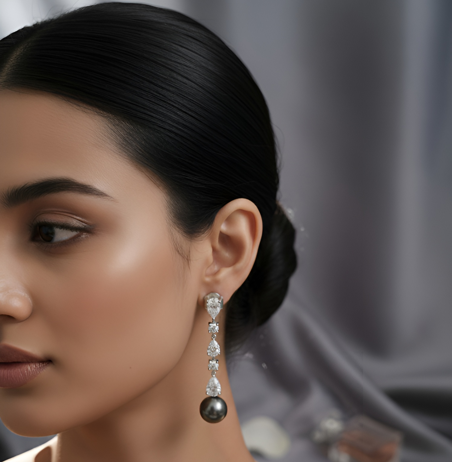 Each stone glimmers with subtle rhythm, while the pearl rests like a sigh of dusk at your ear.