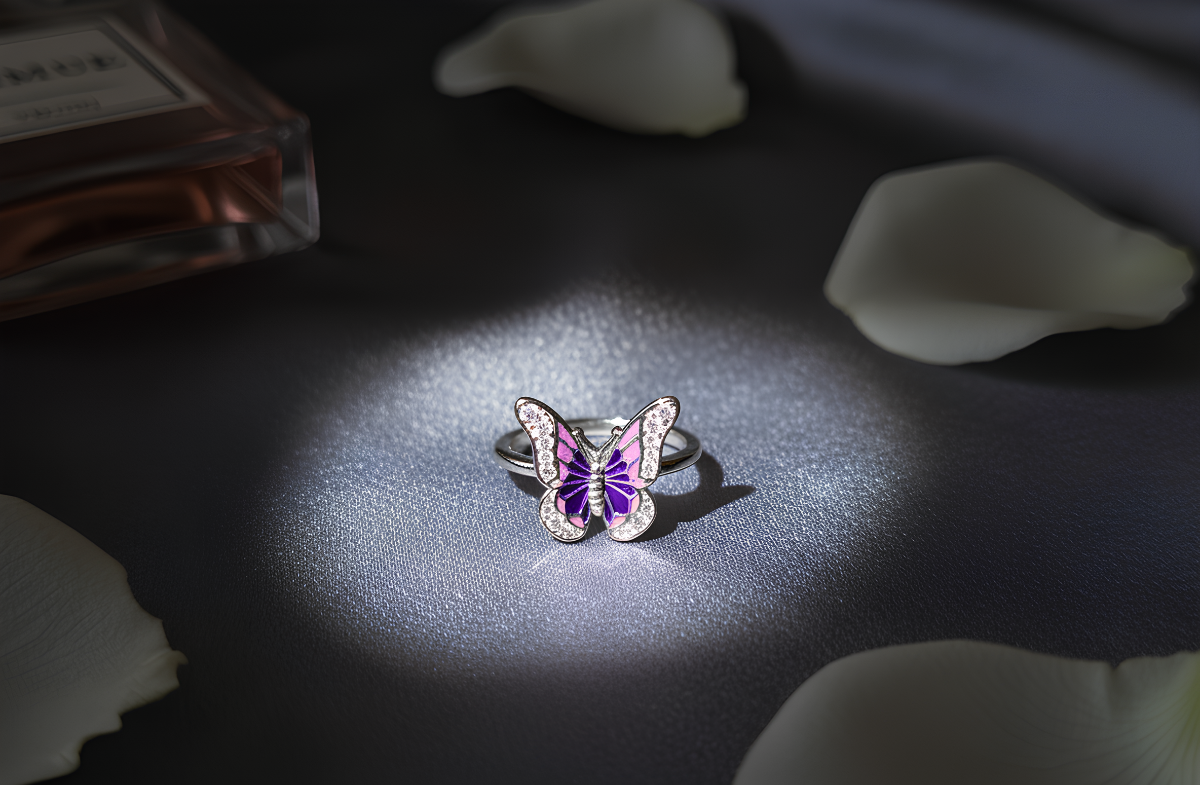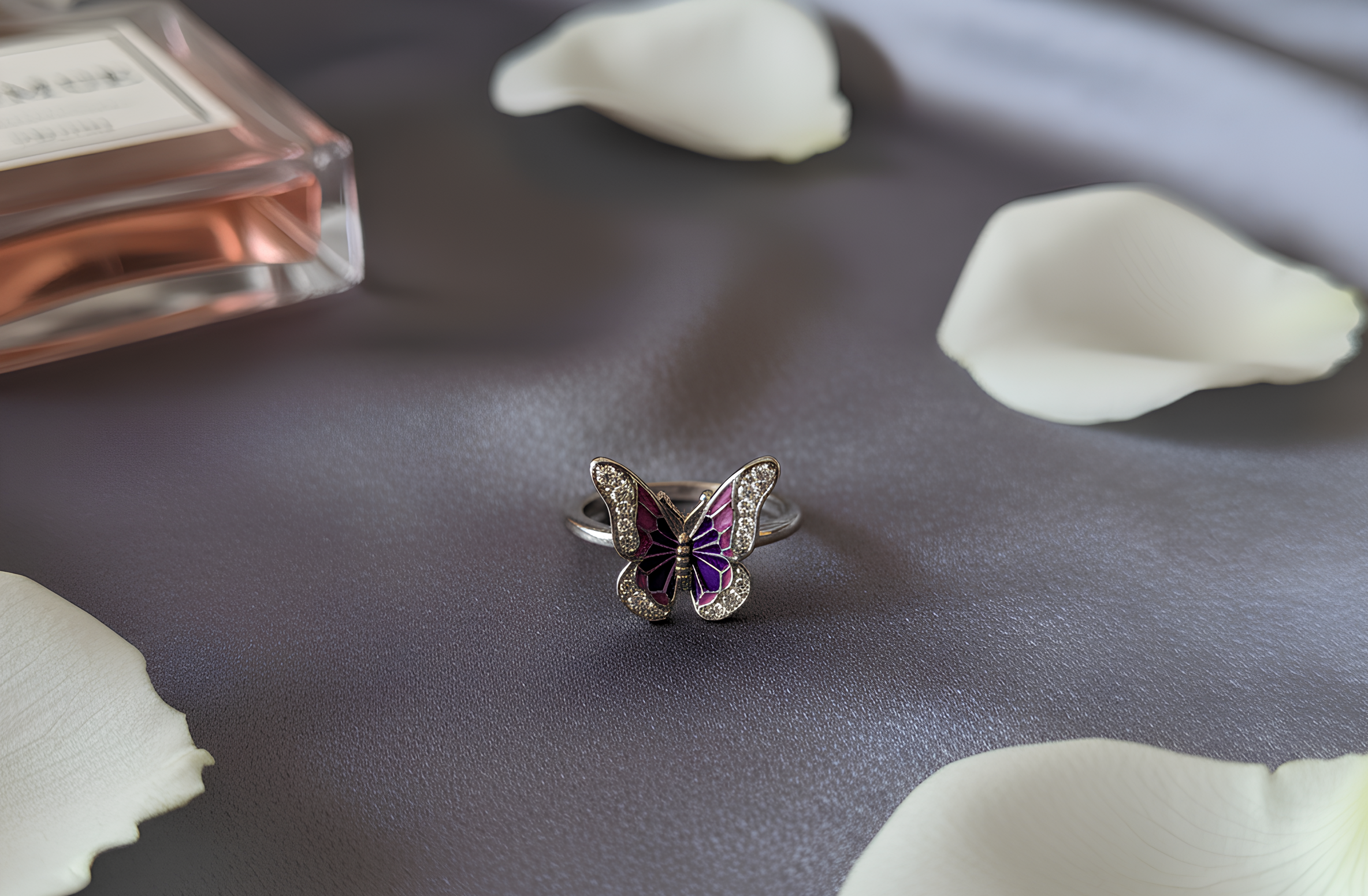 A dainty silver butterfly ring πŸ¦‹ with purple and pink enamel, symbolizing transformation and beauty.