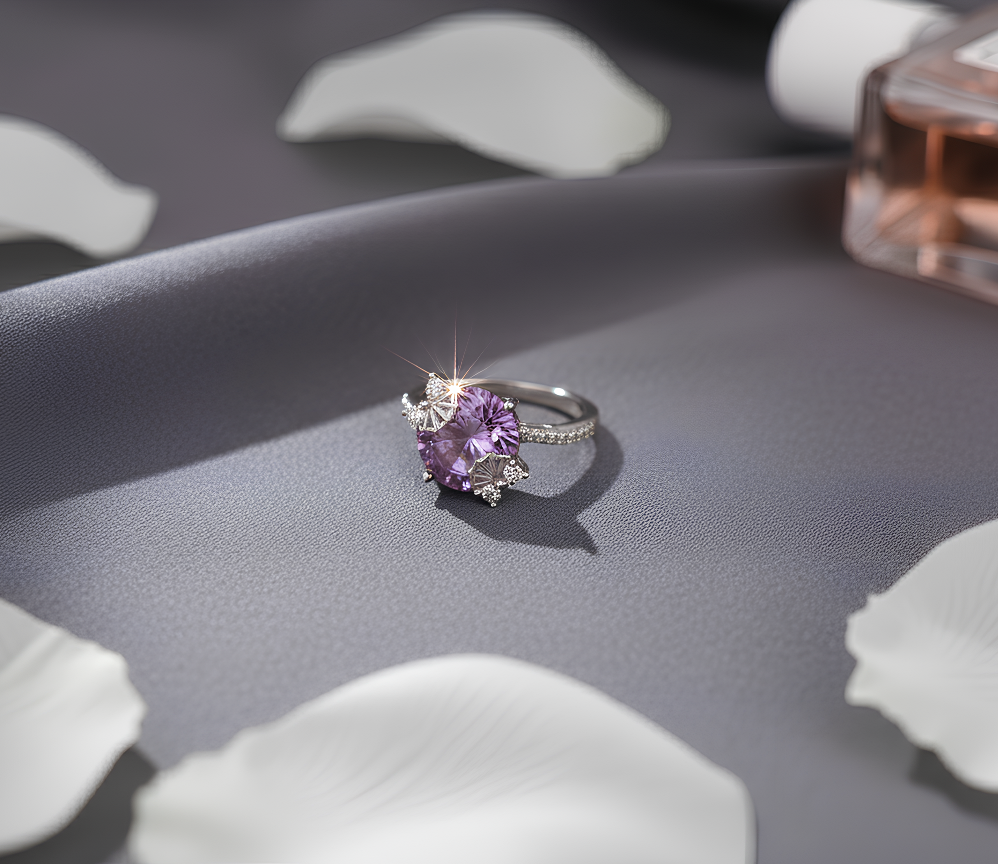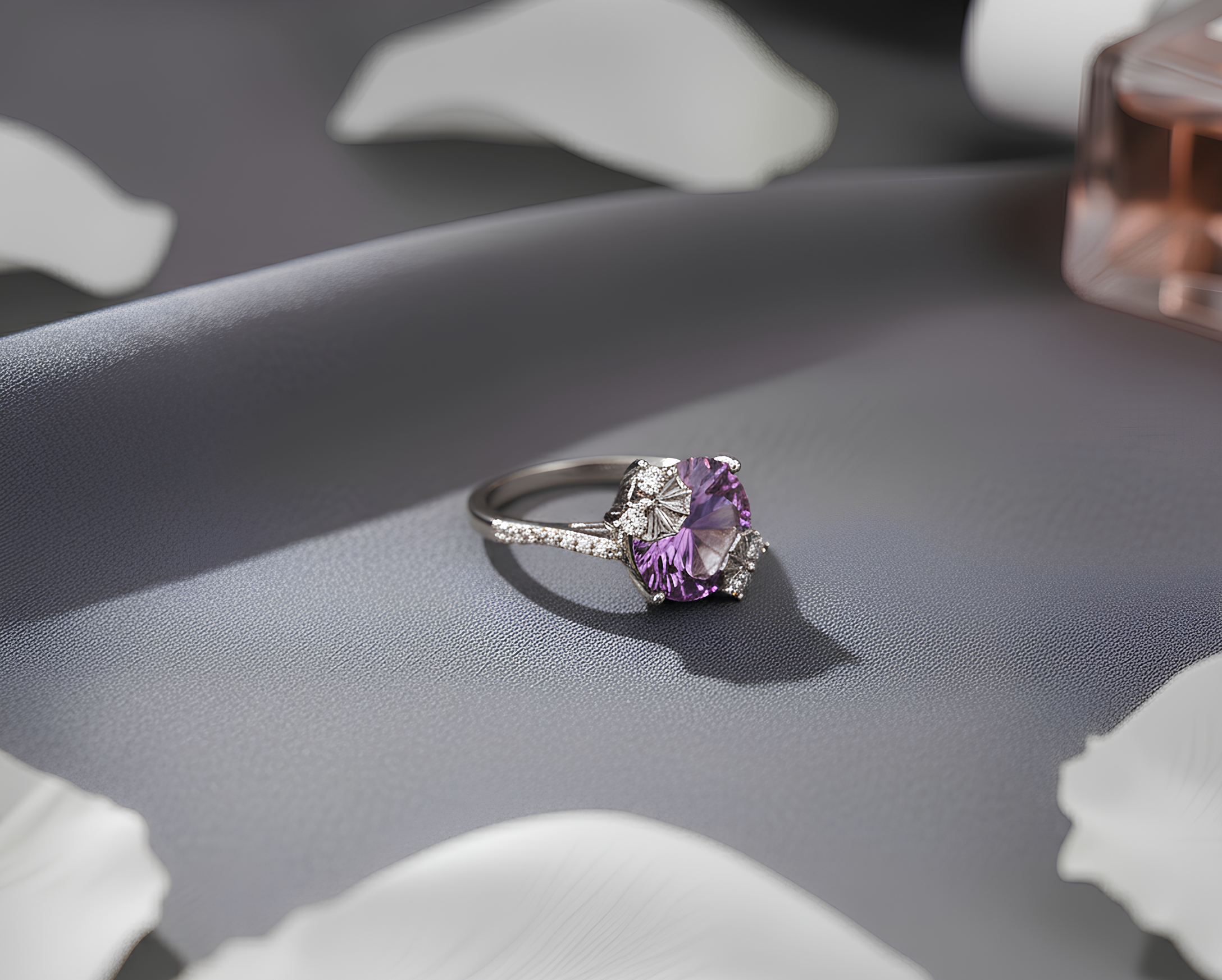 - π Pop of Purple: Round amethyst-like solitaire adds vibrancy and depth.