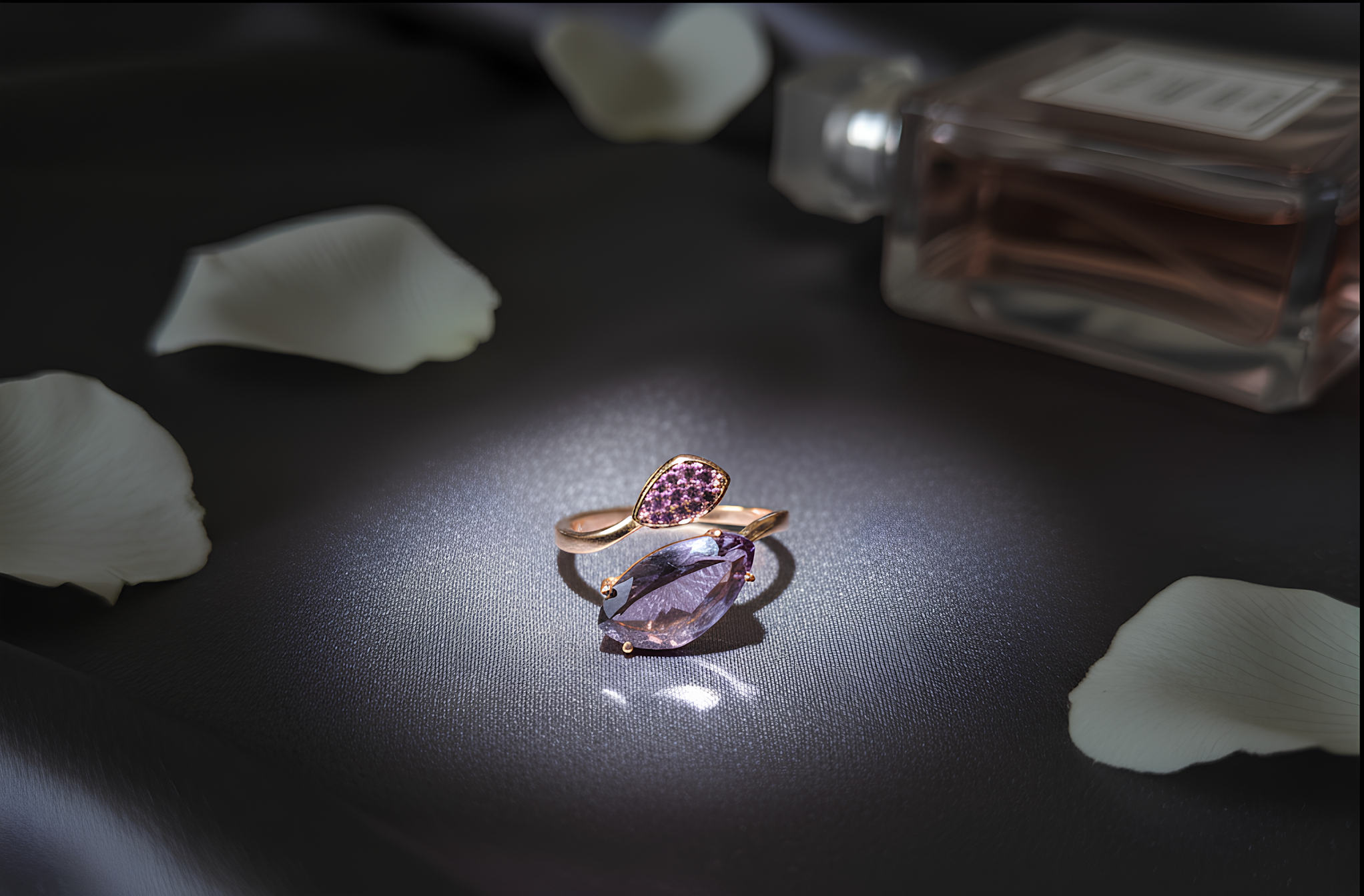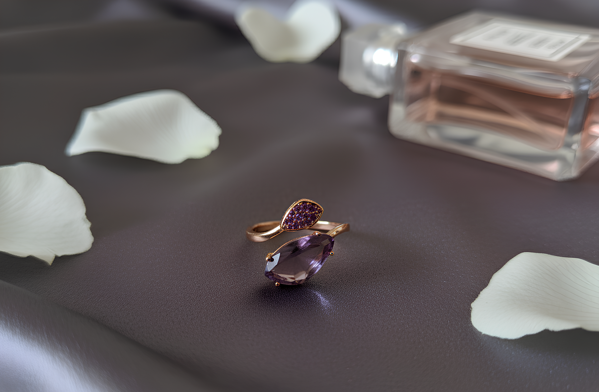 This adjustable open ring features an asymmetrical style with a horizontally set mauve teardrop zirconia on one end and a cluster of tiny purple stones on the other, creating a perfect balance of sophistication and playfulness. Its gold finish adds a warm, luxurious glow, making it ideal for stacking or wearing as a statement piece.